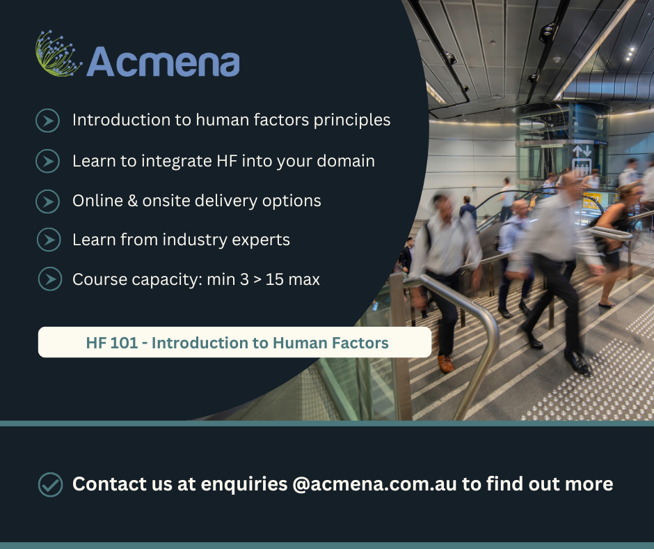 Acmena’s human factors courses are available for private delivery by prior arrangement only. Offering unrivaled flexibility and practicality to clients, our training package can be tailored specifically to suit the needs of your team, your organisation’s domain or to reflect the project your are engaged with. Get in touch with us to see how our human factors specialists can enhance the capability of your team.