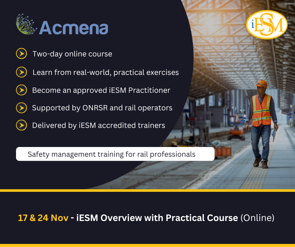 Supported by ONRSR, iESM training courses guide you through the key safety principles, processes, tools and standards you need to develop safer railways.